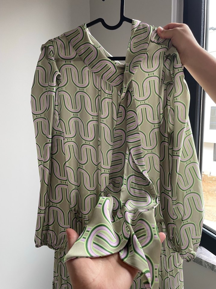 Bu yeşil , tasarımı ve desenli kumaşıyla öne çıkar. Halter yaka ve askılı kollarla, yumuşak sentetik kumaştan yapılmıştır.