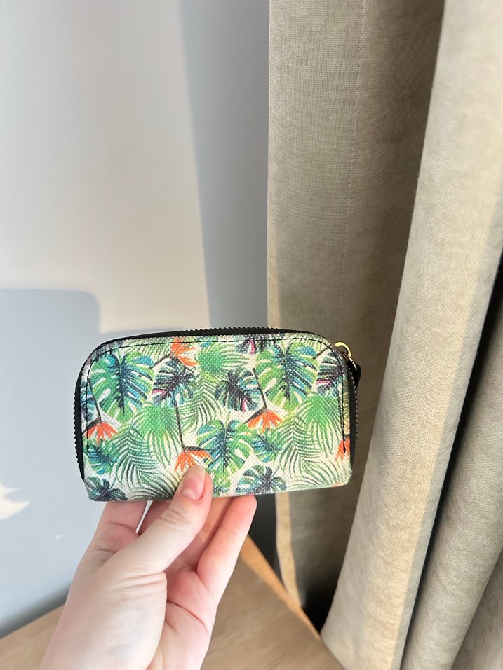 Fermuarlı kapama ve yeşil desenli sentetik kumaştan yapılmış çağdaş kadın cüzdanı, günlük kullanım için uygundur. Kadin/genç cüzdanı temiz kullanıldı hasarı ve problemi yoktur tertemiz bir ürün