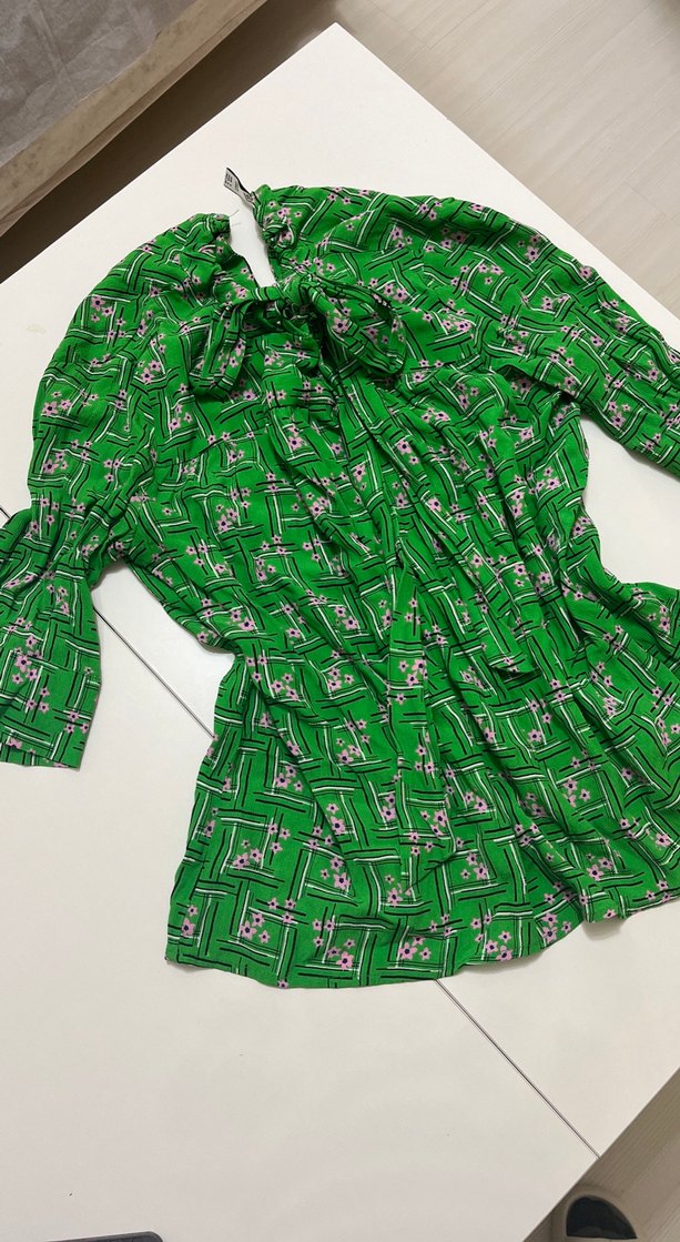 Yeşil renkte, uzun kollu ve düğmeli, bol kesim h bluz. Canlı desenli kumaştan, günlük sokak stili için uygundur.