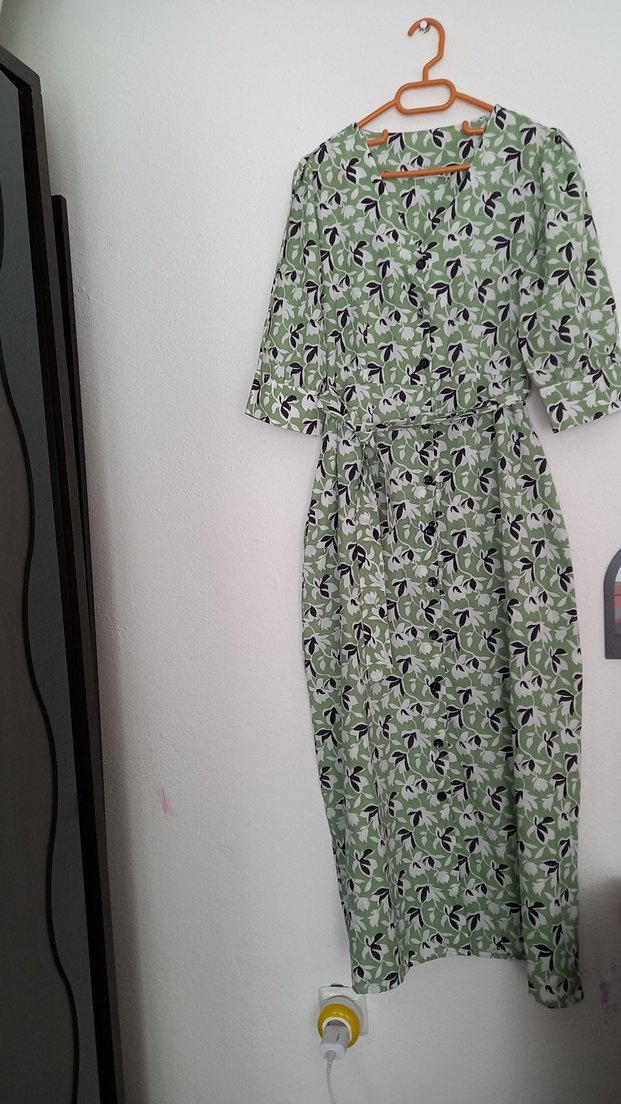 Pamuk kumaştan, uzun, bol kesim, kısa kollu, V yakalı, yeşil ve gri çiçek desenli hamile elbisesi. Drapeli tasarıma sahiptir.