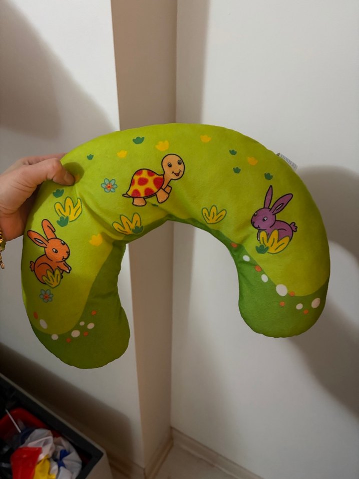 Pastel yeşil renkte, kaplumbağa ve tavşan desenli hamile ve emzirme yastığı, rahat destek sağlar.