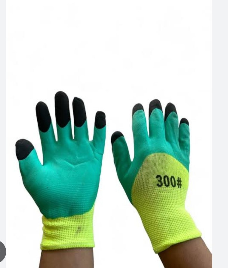 Yeşil tabanlı, siyah parmak uçlu iş eldivenler. Üzerinde '300#' işareti bulunur, spor ve sade tarzda.