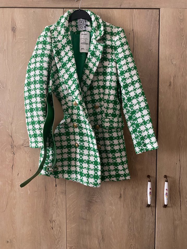 Notch yaka, kemerli ve midi boy olan bu kadın blazer ceket, hafif yeşil desenli ve Paris sokak modasına uygun, şık ve rahat bir tasarımdır.
