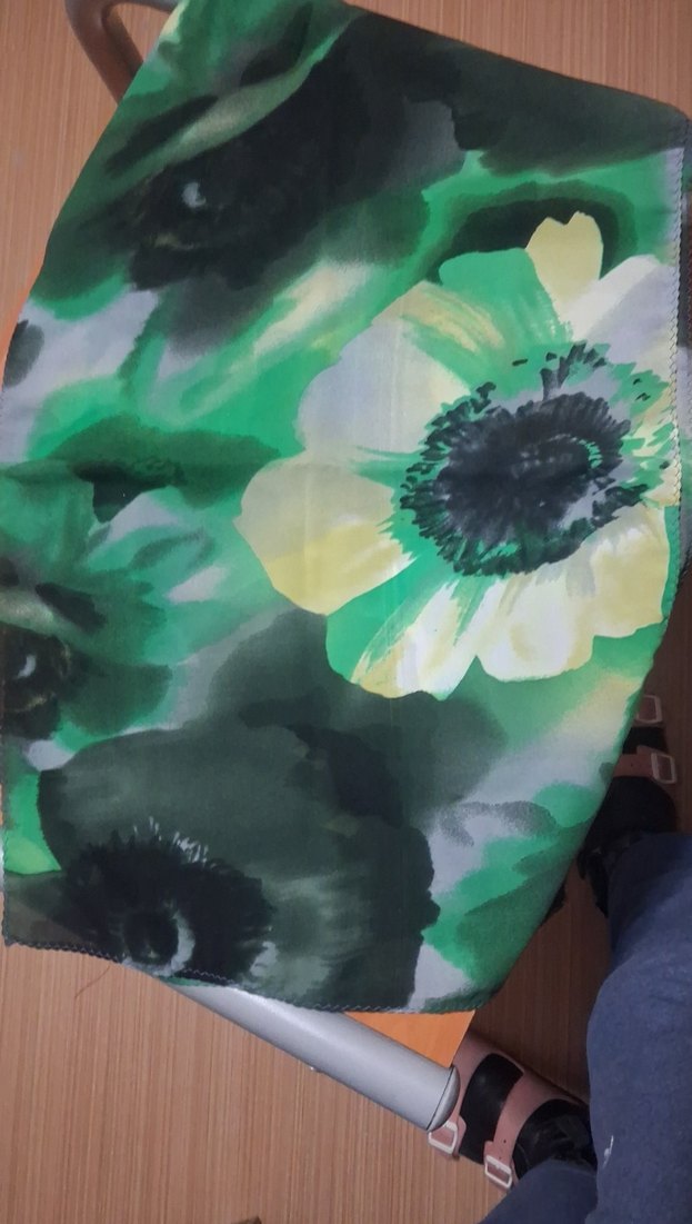 Kadınlar için yeşil çiçek desenli, akıcı sentetik kumaştan drapeli fular. Avant-garde tarzı sevenler için ideal. bir tarafında hafif cizgiler var. fotografta görünüyor.