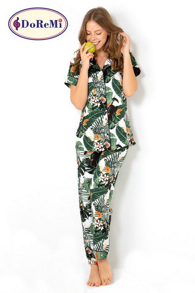 DoReMi markalı, kısa kollu, uzun paçalı, bol kesim kadın pijama takımı. Yeşil tropikal yaprak ve çiçek desenli rahat tasarım.