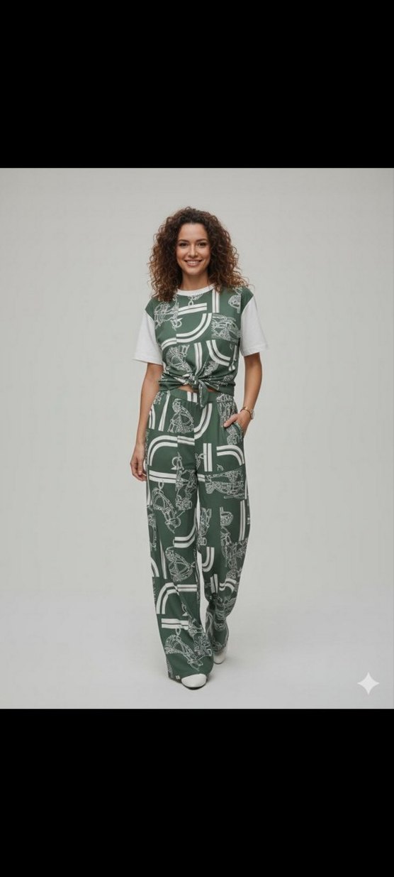 Kadınlar için regular fit, kısa kollu ve bisiklet yakalı yeşil renkli desenli tekstil kumaştan yapılmış ikili takım Günlük kullanım için uygun, rahat ve şık bir sokak stili ürünü. miyaka markasına ait. beden sorunuz