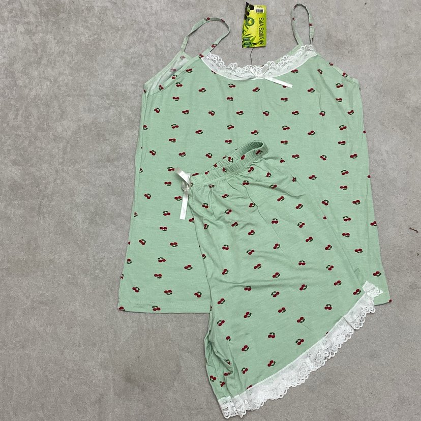 Yeşil renkte, kiraz desenli, dantelli kısa kollu ve şortlu bol kesim kadın pijama takımı.