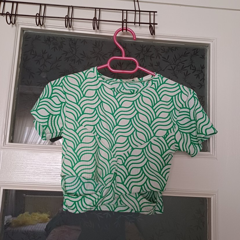 Sentetik kumaştan yapılmış, yeşil renkli desenli, pileli detaylı ve kısa kollu kadın bluz. Yuvarlak yakalı, kısa boylu, bohem ve retro tarzda günlük kullanım için uygundur.