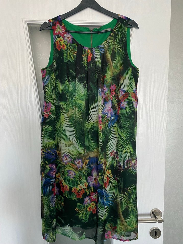 Yeşil tonlarında tropikal desenli, askısız, salaş kesim midi elbise, dış mekan kullanımı için uygun, drapeli tasarım içerir.