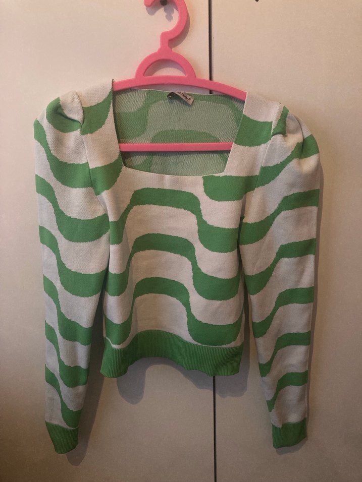 Uzun kollu, tekne yaka, yumuşak triko kumaştan yapılmış salaş kesim kadın kazak. Pastel yeşil batik desenli ve midi boyda, günlük kullanıma uygun.