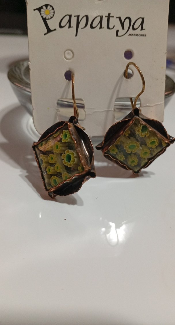 Koyu yeşil desenli, boncuk detaylı kısa boyda, vintage bohem tarzda mini küpe. Romantik
