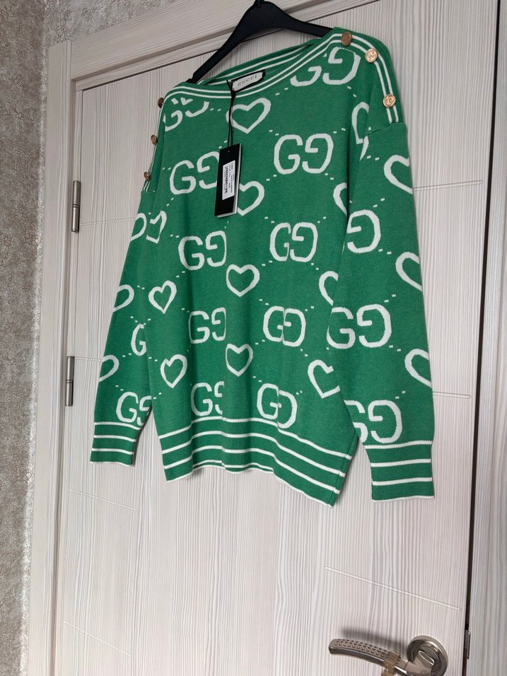 Renkli desenlere sahip yeşil örgü kadın kazak, bol kesim ve yuvarlak yakalı. Kısa boyda, günlük kullanım için uygundur. Omuzda düğme detayları ve "G9" yazısı bulunur. M Beden Ancak L Uyumludur