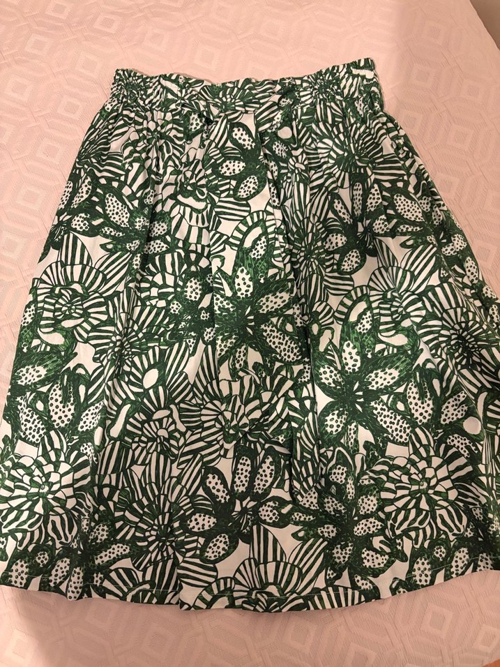 Yeşil desenli pilili ve bol kesimdir. Sentetik kumaştan yapılmıştır, midi boyda ve bohem tarzındadır. Açık hava kullanımı için uygundur.