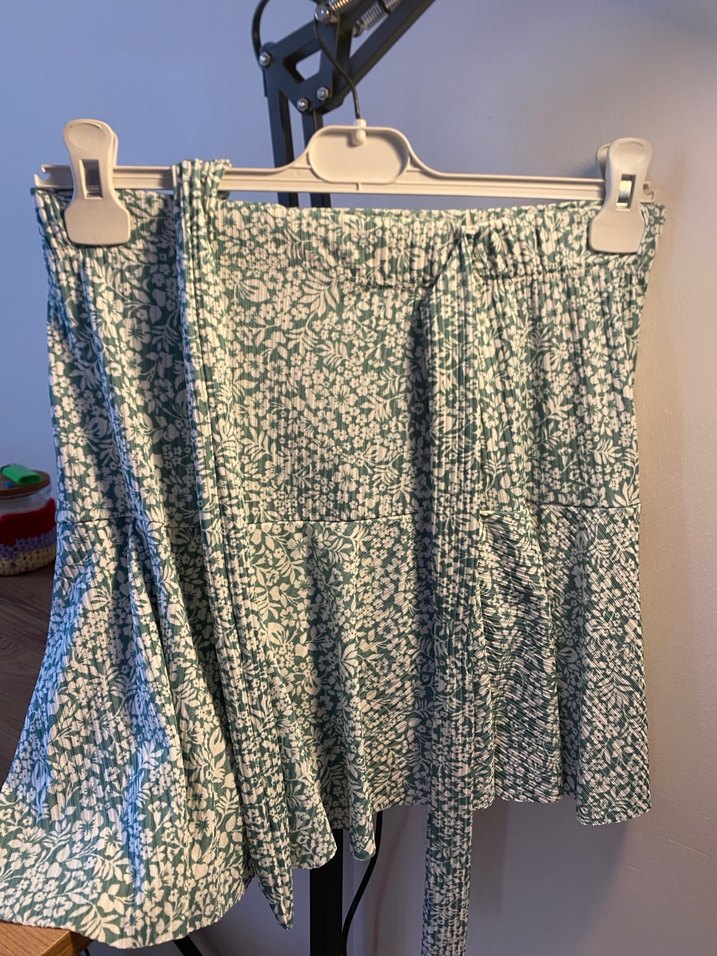 Yeşil ve gri tonlarda desenli, pilili ve bol kesim mini etek. Bohem tarzıyla açık hava için uygundur. . . Ici sortludur ve ic gostermiyor. Cok iyi durumda yalnizca bir kac kez giydim dileyen olursa detayli fotograflarini paylasabilirim.