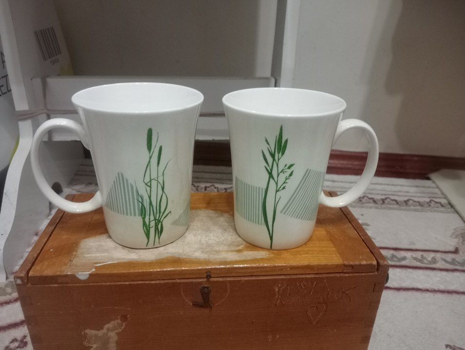 Pastel yeşil bitki desenli, kulplu porselen 2'li kupa seti. ☕