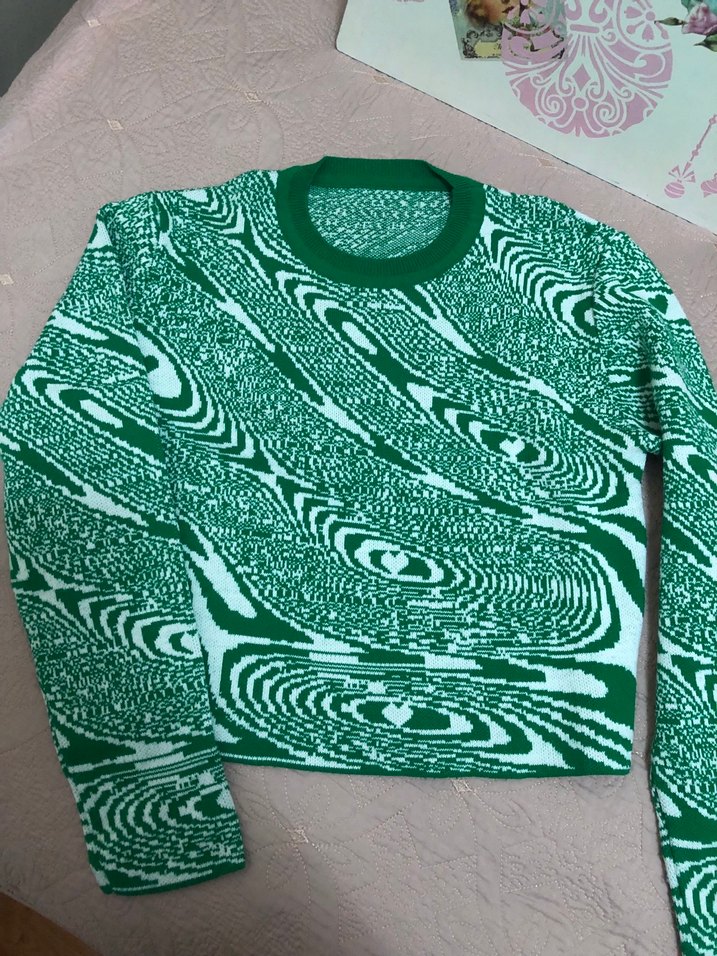 Fitted kesim, uzun kollu ve yuvarlak yakalı yeşil triko kazak. Özgün dalgalı desenli, günlük ve sokak stiline uygun. Standart beden sorunu yoktur