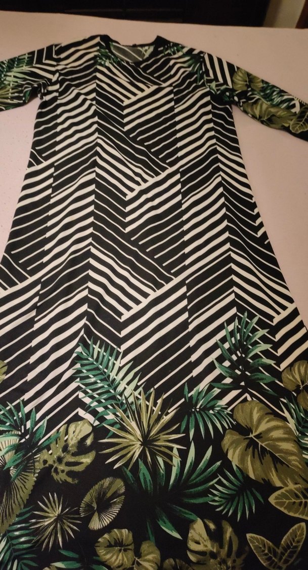Yeşil renkli, desenli ve uzun elbise. Kayık yaka ve askılı kollara sahip, rahat kesimli bohem tarzda günlük kullanım için uygun. hiçbir defosu yoktur alana hayırlı olsun