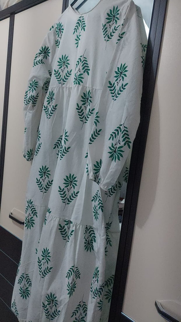 Yeşil desenli, uzun boylu, bol kesim, yüksek yaka ve uzun kollu, hafif sentetik kumaştan bohem tarzda drapeli elbisedir.