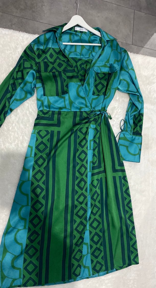 Drapeli tasarıma ve V yakaya sahip uzun midi yeşil desenli saten elbise. Bohem stile uygun, regular fit ve askılı kolludur.