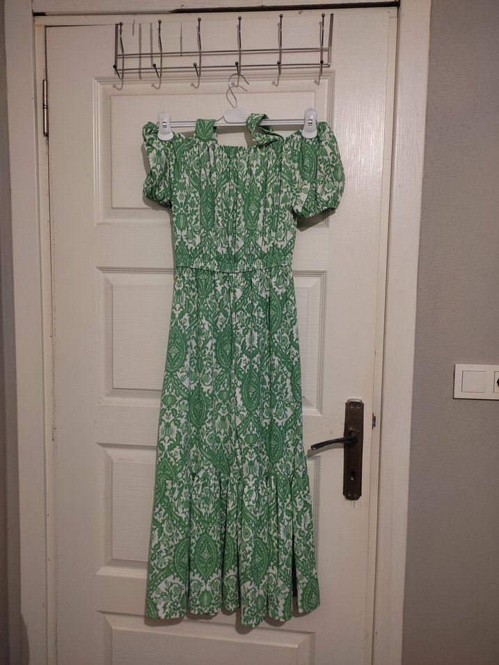 Yeşil yılan desenli bu elbise, askılı kolsuz ve kemerli. Rahat kesimli, sentetik kumaştan, günlük kullanım için uygundur.