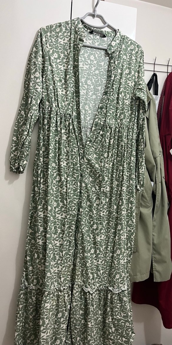 Uzun kollu, bol kesim ve drapeli tasarıma sahip, yeşil-gri desenli bohem tarzda uzun elbise.