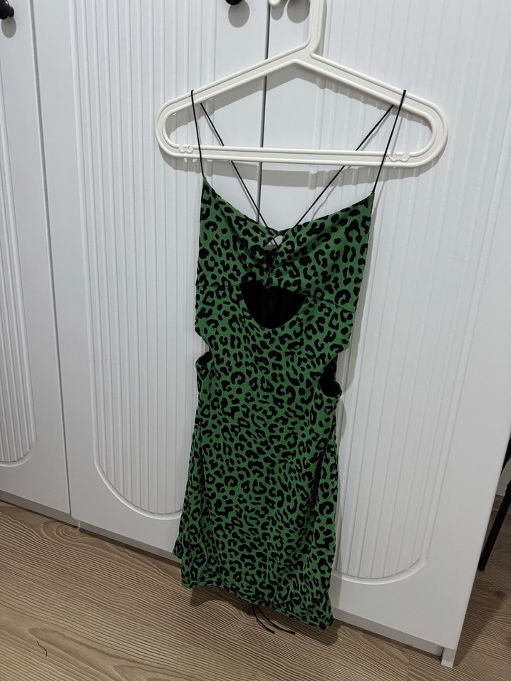 Dar kesim, uzun boylu mini elbise, halter yaka ve ince askılarla. Sentetik kumaştan, koyu yeşil yılan desenli ve zincir detaylı, dış mekan sokak giyimine uygun.