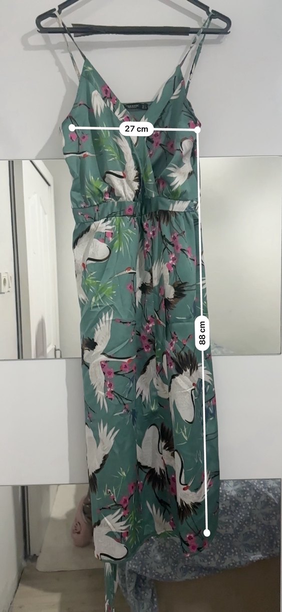 Yeşil renkli, bol kesim, V yaka ve kolsuz uzun elbise. Yumuşak sentetik kumaştan, desenli ve fermuarlı, açık hava kullanımı için uygundur.