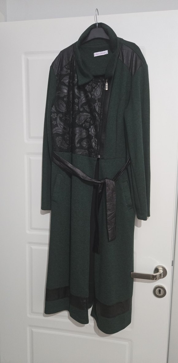 Yeşil desenli uzun kadın kaban, kemerli ve notched yakalıdır. Sentetik kumaştan, strappy kollu ve ofis için uygundur. Goth ve avant-garde tarzında.