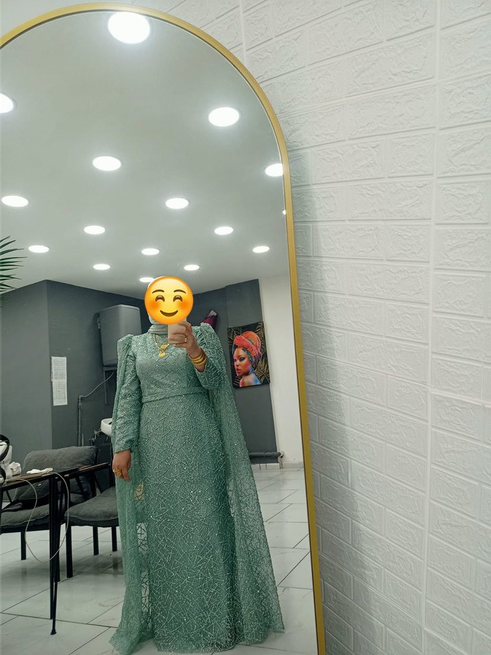 Uzun yeşili abiye, yüksek yakalı, uzun kollu ve drapeli tasarıma sahip, düğünler için uygun, sade ve avangart stil.Balık model 44 beden kilo 67 boy 160 ile kullanıldı