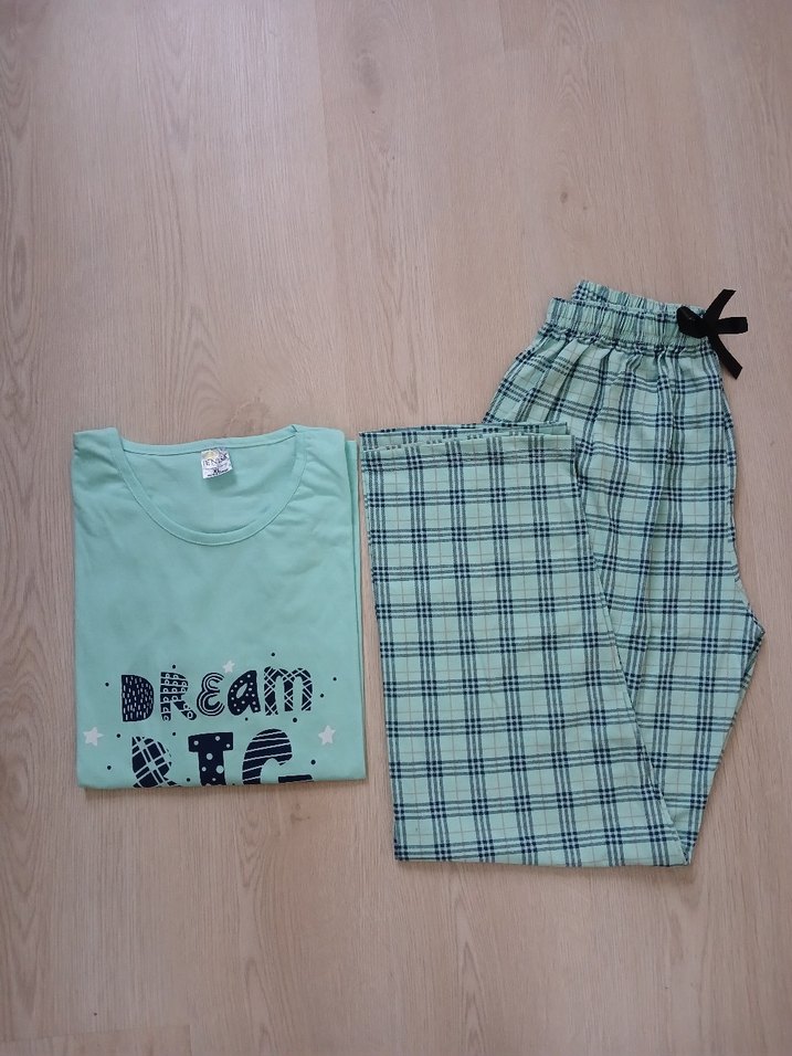Rahat kesim, uzun kollu kadın pijama takımı. Pastel yeşil üstünde 'Dream Big' baskısı, kareli desenli alt ve siyah fiyonk detayı içerir.