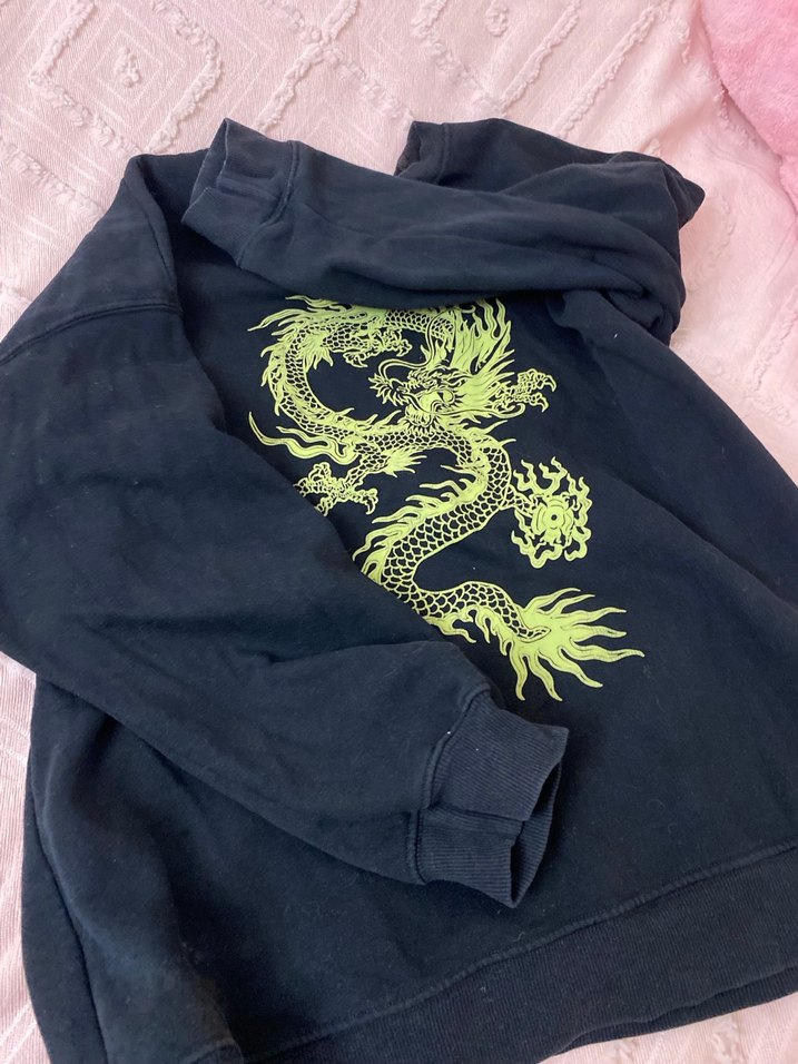 Yüksek yakalı, uzun kollu ve bol kesim kadın sweatshirtü. Koyu yeşil ejderha desenli, fermuarlı, ipeksi kumaştan, günlük kullanım için uygun.