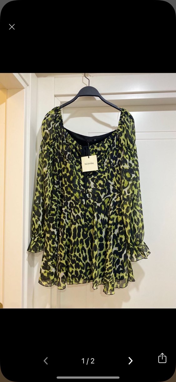Uzun kollu, salaş kesim ve fırfırlı detaylı mini elbise. Sentetik kumaştan, koyu yeşil desenli, sokak modasına uygun.