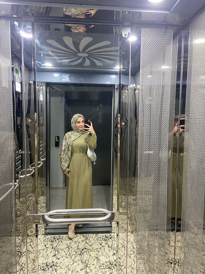 Yüksek yakalı ve uzun kollu, yeşil desenli uzun elbise. Metalik kumaştan yapılmış, düzenli kesim ve şeffaf detaylar içerir, ofis için uygun modern klasik tarzda.