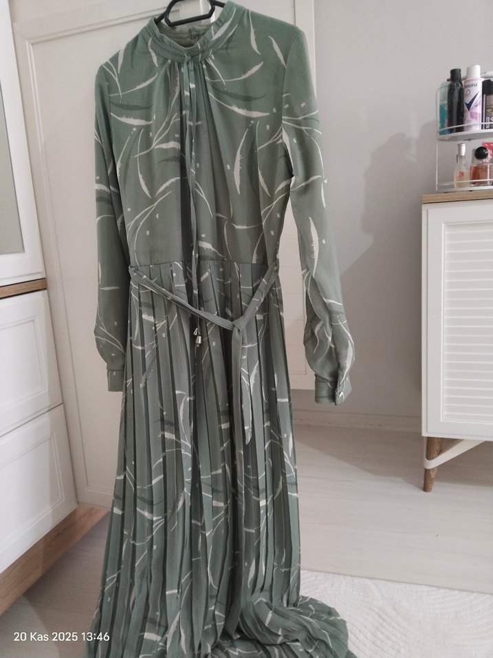 Yeşil renkli, uzun kollu, yüksek yakalı ve bol kesim pilili elbise. Yumuşak sentetik kumaştan, bohem tarzda desenli.