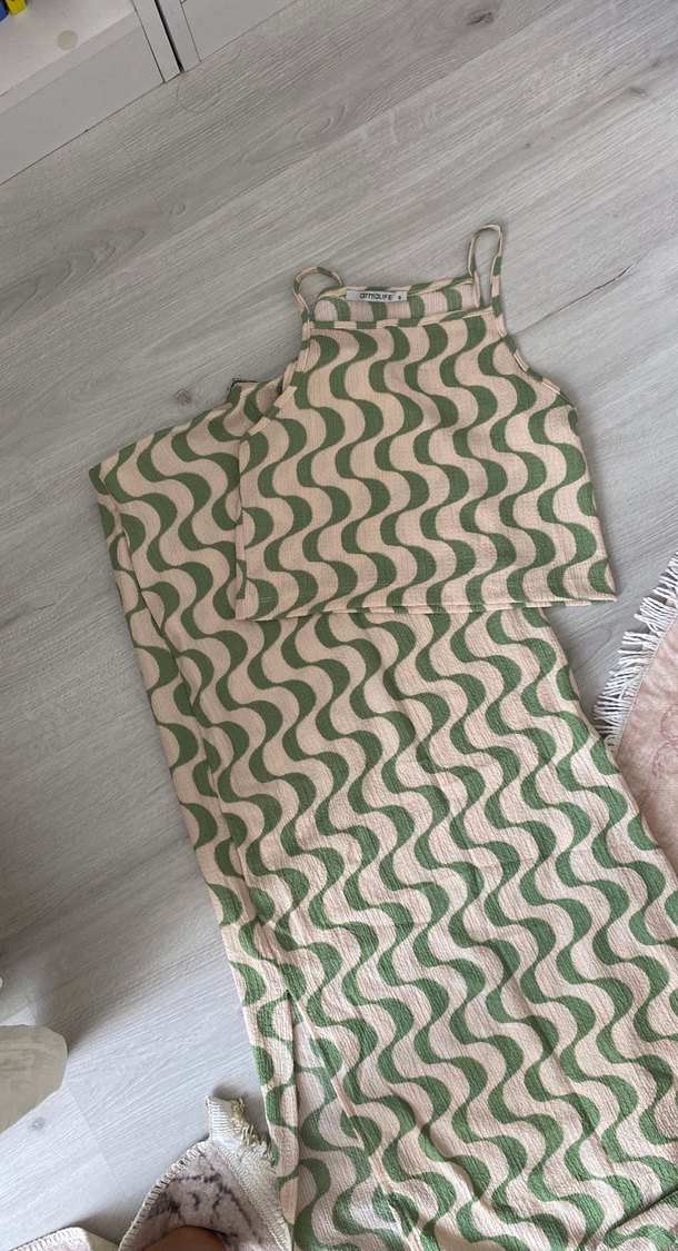 Yeşil yılan desenli uzun yırtmaçlı takım, pliseli ve kayık yaka detaylıdır. Askılı kollu, rahat kesimiyle bohem ve retro tarzlara uygundur. Yumuşak sentetik kumaştan yapılmıştır, günlük kullanıma uygundur.