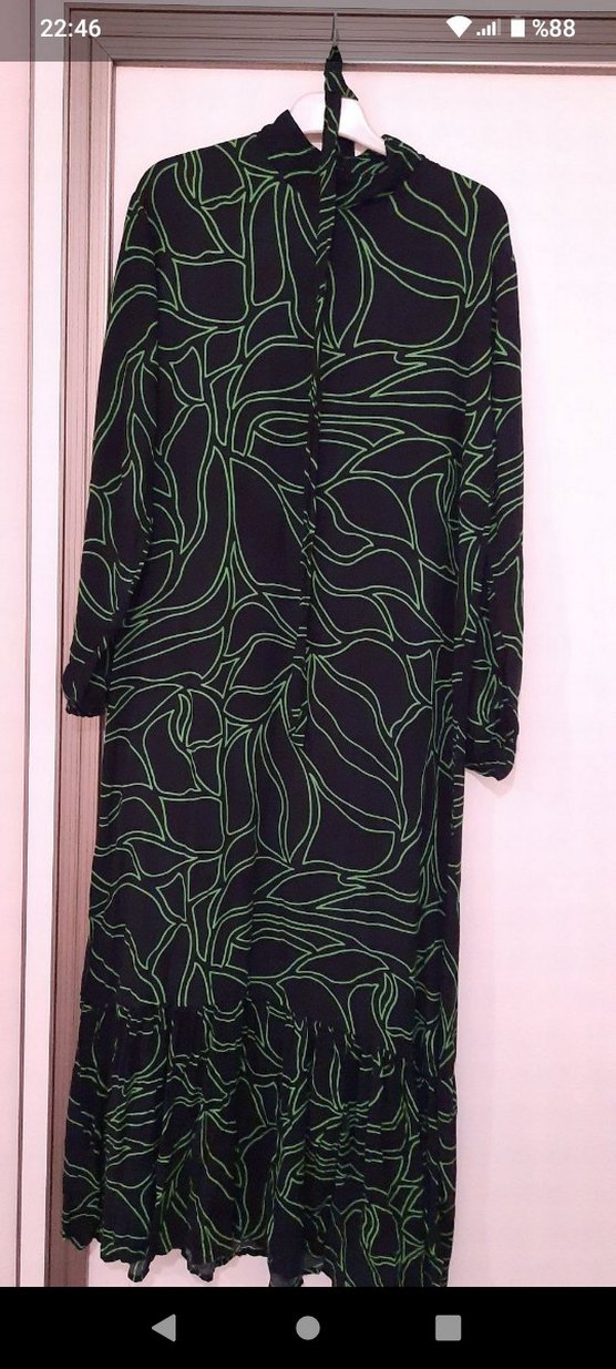 Uzun, salaş kesim kadın elbisesi koyu yeşil desenli, uzun kollu ve yüksek yakalıdır. Hiç bir sorunu yok Tam yazlık tiril tiril