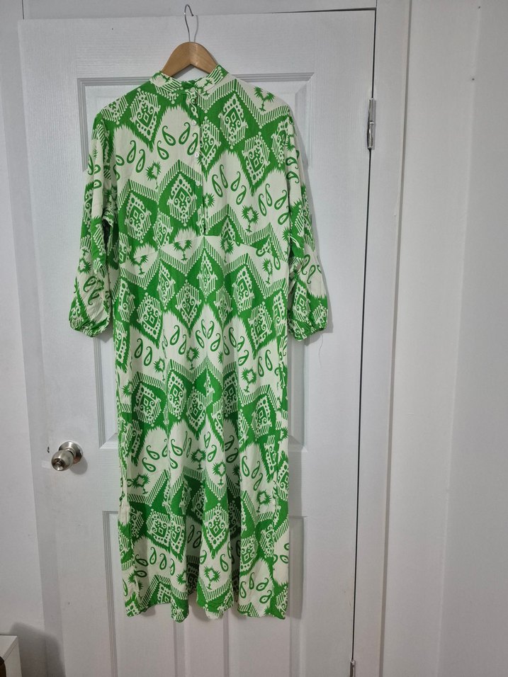 Yeşil renkli, desenli uzun bohem elbise. Rahat kesimli, drapeli tasarım, uzun kollu ve V yakalıdır. pamuk viskon kumaştan üretilmiştir. yıkandı cekme yapmaz 46 48 bedene rahat olur