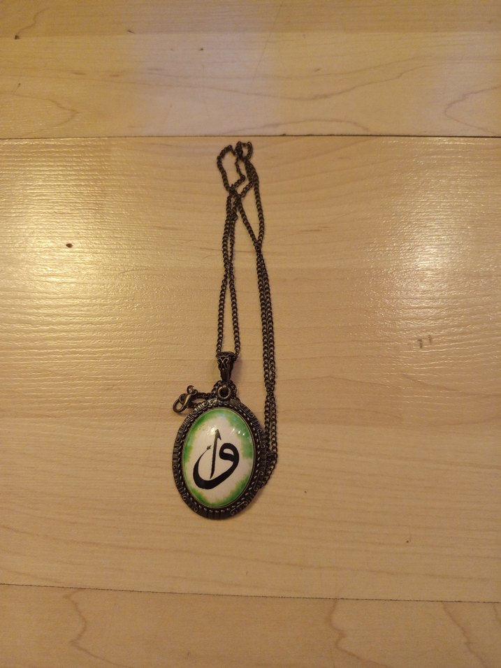 Uzun zincirli, koyu yeşil yılan desenli, kaligrafik tasarımlı oval kolye. Günlük kullanım için uygun, vintage tarzda.