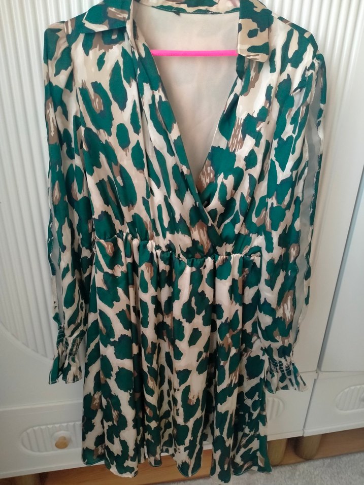 Yeşil ve bej desenli, v yakalı, dökümlü ve uzun kollu, bol kesim midi elbisedir. Yumuşak sentetik kumaştan üretilmiştir.
