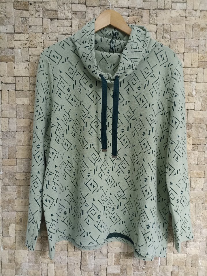 Yesil renkte, yüksek yakalı ve uzun kollu gevşek kesim kadın triko kazak. Yumuşak fleece kumaştan üretilmiş, baskılı desenli ve günlük rahat stil için uygun. Beden XXL iki kol arası 66 cm uzunluk 71 cm