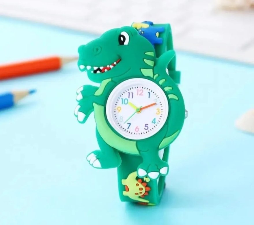 Renkli dinozor desenli, plastik kayışlı ve tokalı yeşil çocuk kol saati. Kadranda kolay okunabilir çok renkli sayılar bulunur.