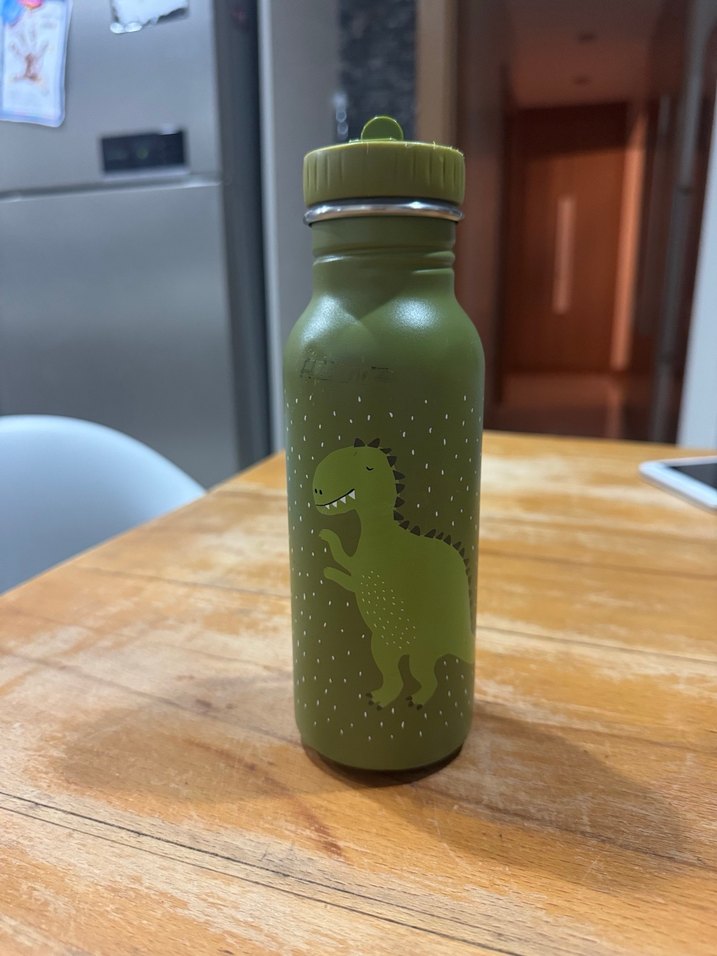 Koyu yeşil renkte, dinozor desenli çocuk termosu. Sıkıca kapanan kapakla içecekleri sıcak veya soğuk tutar.