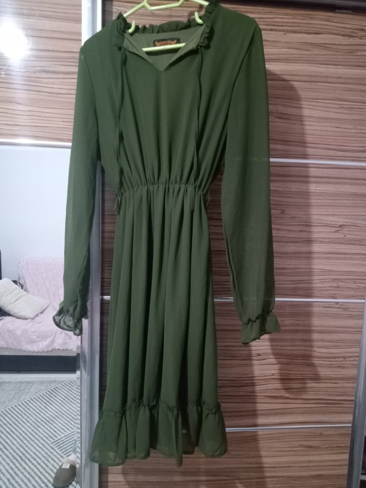 Koyu yeşil, bol kesim, uzun kollu ve V yaka uzun elbise. Yumuşak sentetik kumaştan, hafif pileli ve fırfırlı etek ucu detaylı, günlük kullanıma uygun.