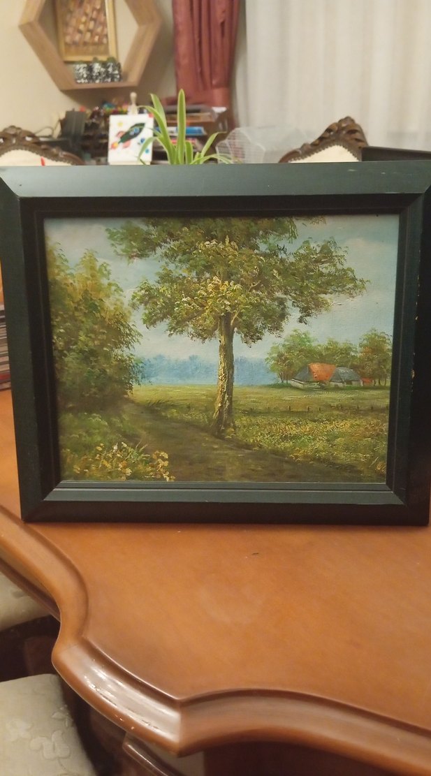 Bu çerçeveli tablo, belirgin bir ağaç ve uzakta bir ev ile yeşil doğa manzarasını gösterir. yağlı boya