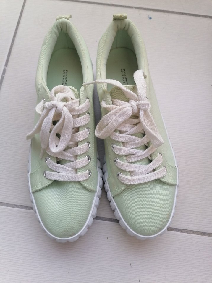 Pastel yeşil renkte, dolgu topuklu ve kauçuk tabanlı kadın spor ayakkabısı, günlük sokak stiline zahmetsiz şıklık katıyor.