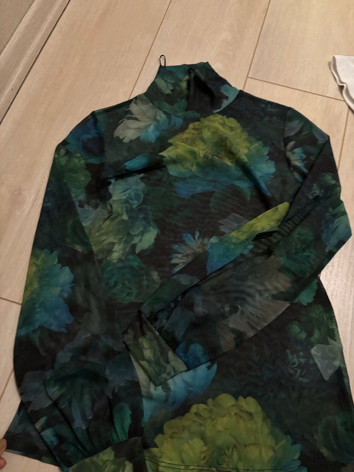 Yeşil tonlarında tie-dye desenli, balıkçı yakalı, drape detaylı ve uzun kollu, vücuda oturan midi boy kadın bluz. Günlük sokak tarzına uygundur.