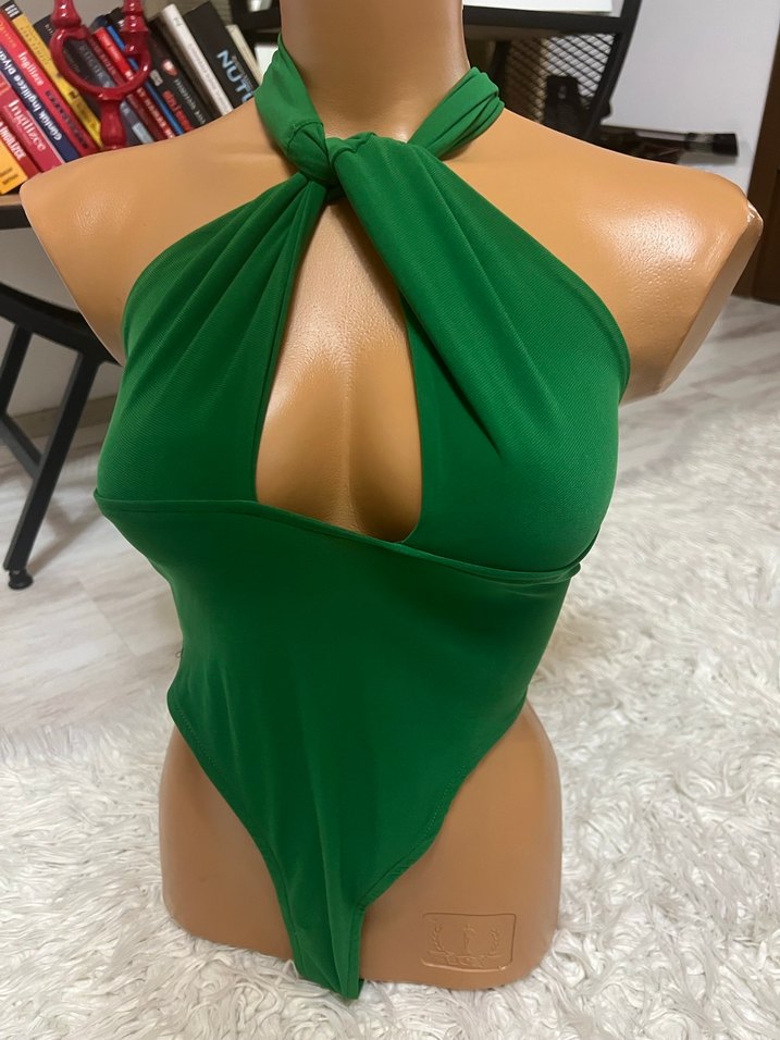 Bu yeşil monokini, parlak kumaş, drapeli tasarım ve askılı yaka detayına sahiptir. Kısa ve vücuda oturan kesimiyle minimalist ve cesur parti tarzına uygundur.