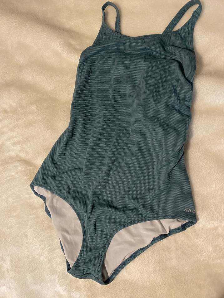 Drapeli ve askılı, yeşil renkte kadın mayo. Normal, sade ve rahat günlük kullanım için uygundur.