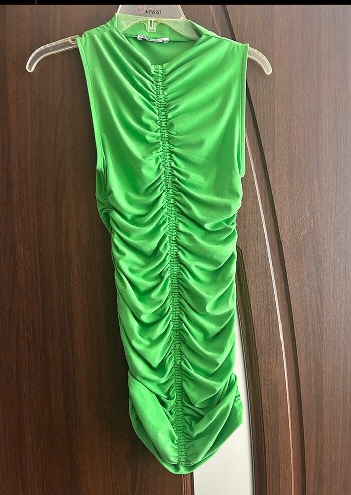 Parlak yeşil, drapeli, kolsuz, yüksek yakalı ve yılan desenli kısa abiye elbise, parti için uygun.