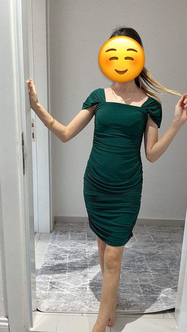 V yakalı, kısa kollu, drapeli detaylı, koyu yeşil midi elbise, parti için uygun.
